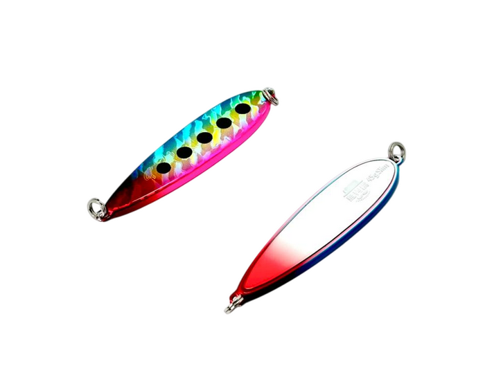 Блесна для ловли лосося (кеты) Jackson Sakedanshaku имеет нетипичную форму. В этой модели их две: Slim, имеющий узкое остроносое тело и Round, круглый, как монета. Плоский корпус отлит из свинца, что при высоком удельном весе и небольшом размере, позволяет этой приманке лететь, словно пуля. Быстро тонет, можно быстрее начать проводку. Комбинация флюоресцентных красок и переливающихся разными оттенками наклеек дают отличный результат. Разработана для ловли кеты на поплавочные снасти в устьевой зоне рек, прекрасно себя ведут на течении, как с наживкой, та и без нее. Гарантированная привлекательность для рыбы с первого заброса.