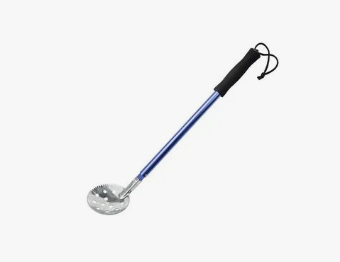 Прочный компактный черпак из нержавеющей стали с телескопической рукоятью из алюминия. Имеет гальванической покрытие синего или красного цвета. Рукоять из "теплого" EVA.