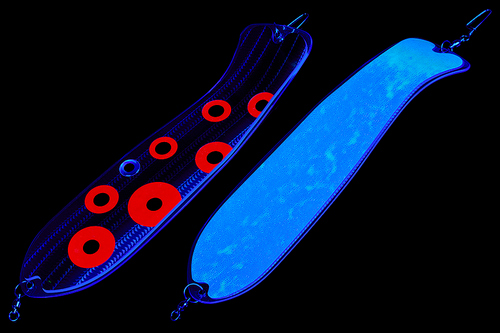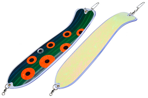 Флешер в форме рыбы прекрасно привлекает лосося на расстоянии. При изготовления тела флешера используется пластик с добавлением пигмента, который светится голубым в ультрафиолете (при дневном солнечном свете). Различные по цветам наклейки предназначены для разнобразных погодных условий. Светонакопительные для утра или пасмурной погоды, также они могут работать в мутной воде. Флуоресцентные цвета могут хорошо работать в солнечные дни. Качественная морская фурнитура позволит ловить не опасаясь за потерю снастей.
