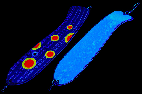 Флешер в форме рыбы прекрасно привлекает лосося на расстоянии. При изготовления тела флешера используется пластик с добавлением пигмента, который светится голубым в ультрафиолете (при дневном солнечном свете). Различные по цветам наклейки предназначены для разнобразных погодных условий. Светонакопительные для утра или пасмурной погоды, также они могут работать в мутной воде. Флуоресцентные цвета могут хорошо работать в солнечные дни. Качественная морская фурнитура позволит ловить не опасаясь за потерю снастей.