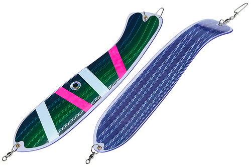 Флешер в форме рыбы прекрасно привлекает лосося на расстоянии. При изготовления тела флешера используется пластик с добавлением пигмента, который светится голубым в ультрафиолете (при дневном солнечном свете). Различные по цветам наклейки предназначены для разнобразных погодных условий. Светонакопительные для утра или пасмурной погоды, также они могут работать в мутной воде. Флуоресцентные цвета могут хорошо работать в солнечные дни. Качественная морская фурнитура позволит ловить не опасаясь за потерю снастей.
