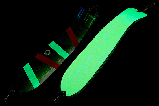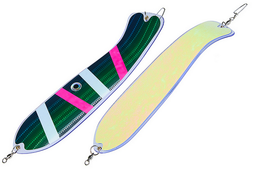 Флешер в форме рыбы прекрасно привлекает лосося на расстоянии. При изготовления тела флешера используется пластик с добавлением пигмента, который светится голубым в ультрафиолете (при дневном солнечном свете). Различные по цветам наклейки предназначены для разнобразных погодных условий. Светонакопительные для утра или пасмурной погоды, также они могут работать в мутной воде. Флуоресцентные цвета могут хорошо работать в солнечные дни. Качественная морская фурнитура позволит ловить не опасаясь за потерю снастей.