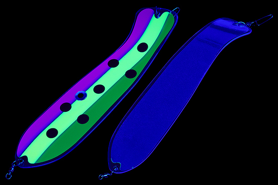 Флешер в форме рыбы прекрасно привлекает лосося на расстоянии. При изготовления тела флешера используется пластик с добавлением пигмента, который светится голубым в ультрафиолете (при дневном солнечном свете). Различные по цветам наклейки предназначены для разнобразных погодных условий. Светонакопительные для утра или пасмурной погоды, также они могут работать в мутной воде. Флуоресцентные цвета могут хорошо работать в солнечные дни. Качественная морская фурнитура позволит ловить не опасаясь за потерю снастей.