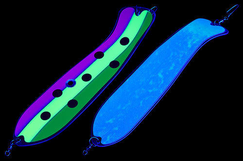 Флешер в форме рыбы прекрасно привлекает лосося на расстоянии. При изготовления тела флешера используется пластик с добавлением пигмента, который светится голубым в ультрафиолете (при дневном солнечном свете). Различные по цветам наклейки предназначены для разнобразных погодных условий. Светонакопительные для утра или пасмурной погоды, также они могут работать в мутной воде. Флуоресцентные цвета могут хорошо работать в солнечные дни. Качественная морская фурнитура позволит ловить не опасаясь за потерю снастей.