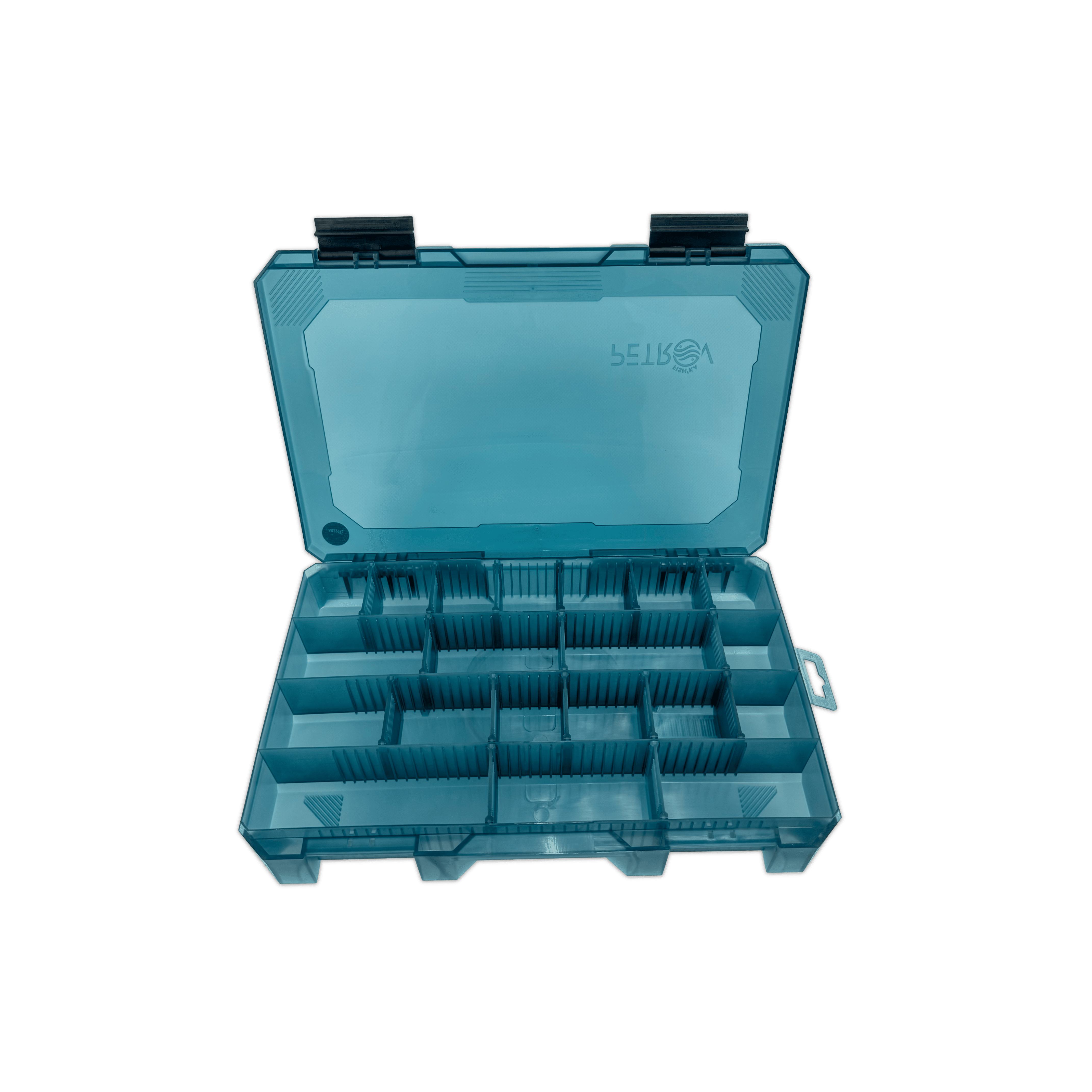 Объем коробки рассчитан на 16 ячеек с возможностью регулировки длины ячейки с шагом 5 мм. Идеально укладывается в ящик «Fish'ka» в количестве 4 шт..