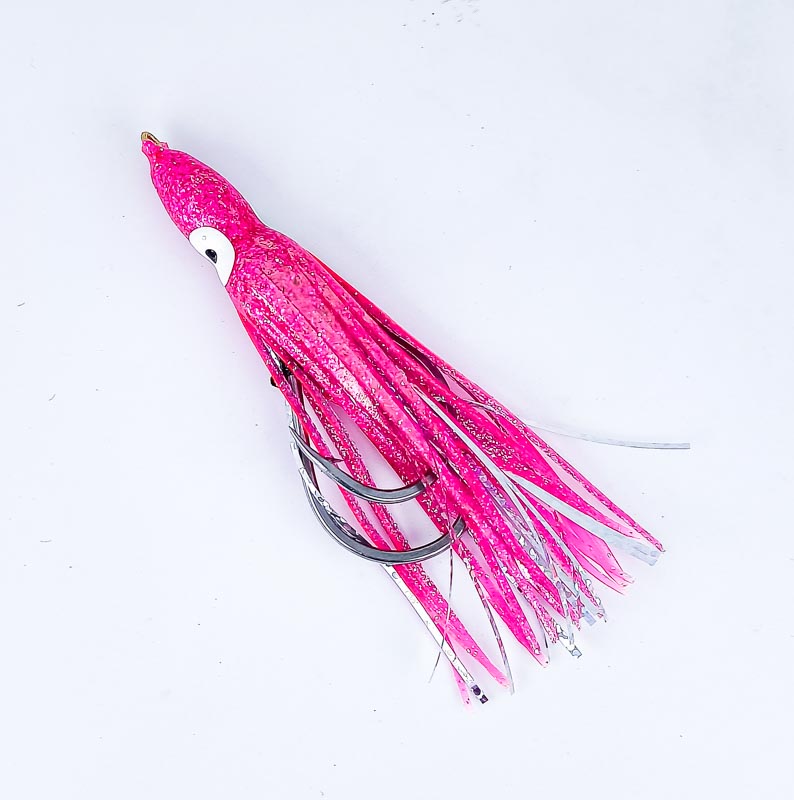 Оснащенный люреском и двойным ассист-хуком октопу для ловли кеты. Используется как дополнительная приманка на кетовых блеснах или колебалках Тасманский дьявол.