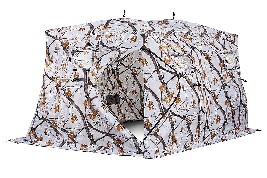 Сдвоенная утепленная трапециевидная зимняя палатка, выполненная в зимнем камуфляже.