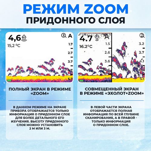 Режимы ФЛЕШЕР, ZOOM и FISH ID позволят детально изучить дно водоёма, придонный слой и даже помогут автоматически распознать рыбу.