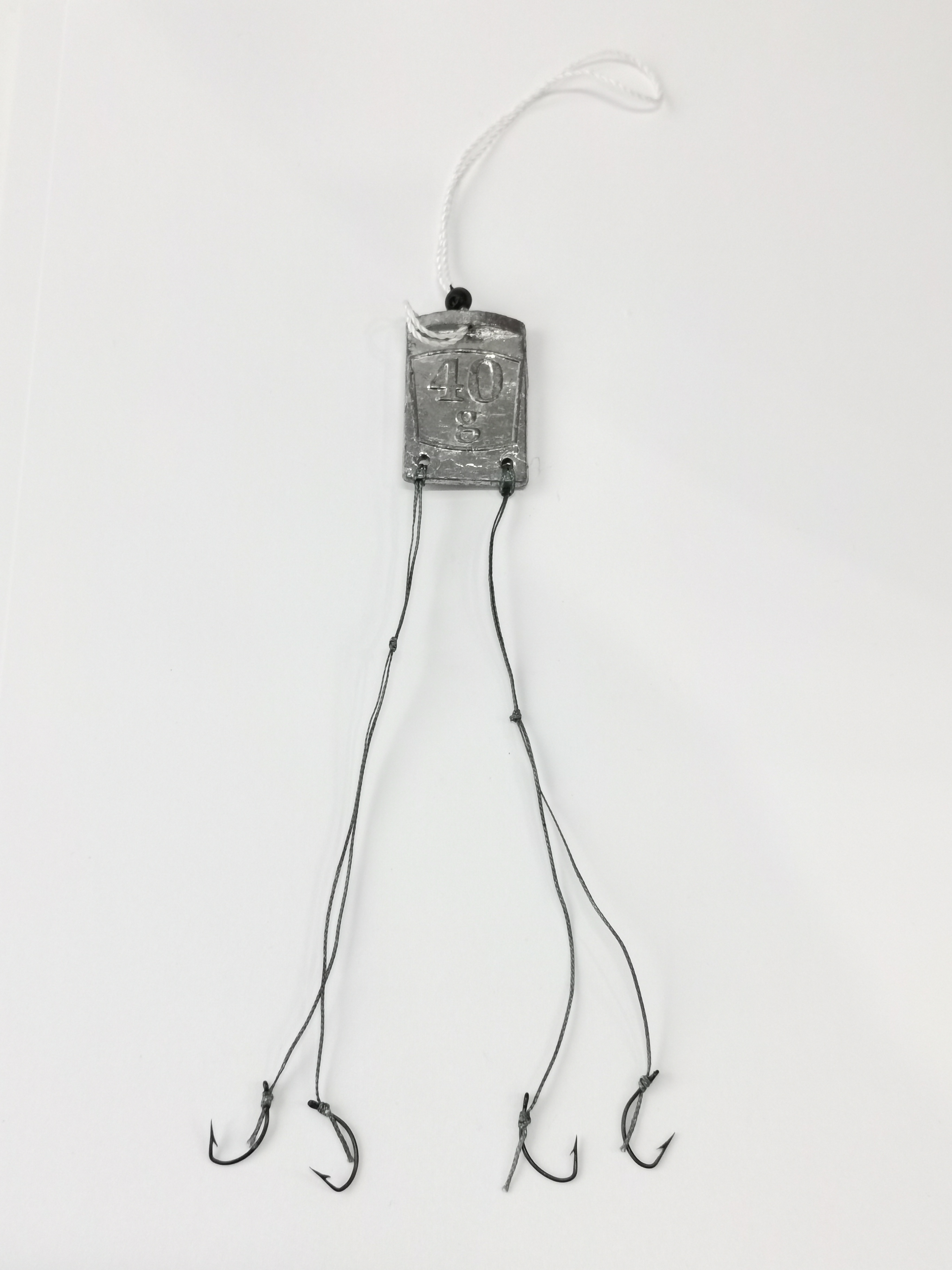 снасть для ловли на жмых. Состоит из петли с самозатягивающим узлом ,небольшим скользящим грузилом ограниченное двумя стопорами и 4 крючками №6-8 на капроновых повоках крепящихся за петлю.