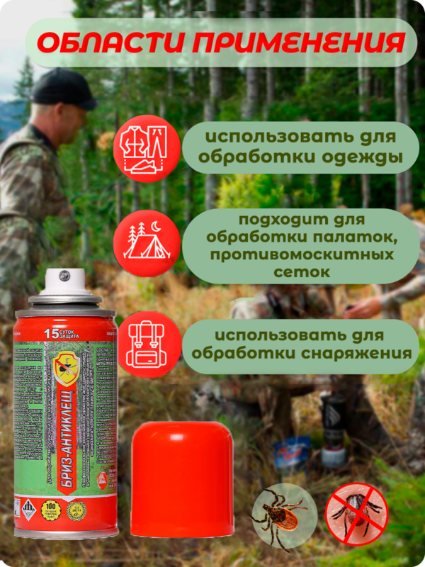 “Бриз-антиклещ” – профессиональное акарицидное средство для обработки одежды в целях защиты человека от нападений иксодовых клещей –переносчиков более 40 известных вирусных заболеваний (энцефалита, болезни Лайма и т.д.).