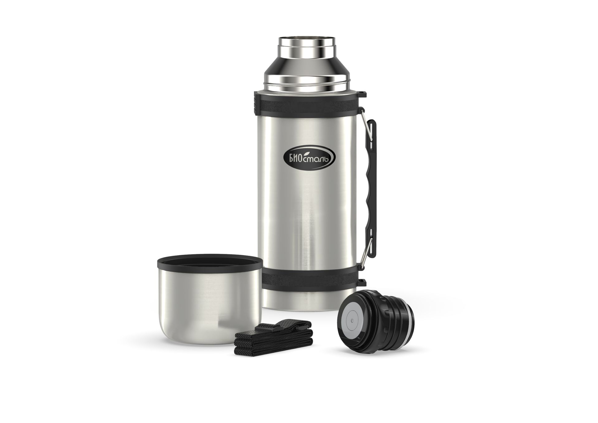 Термос большого объёма с боковой ручкой на корпусе и регулируемым по длине ремешком для переноски. Термос имеет пробку с кнопкой, благодаря которой, можно наливать напиток не откручивая пробку.
