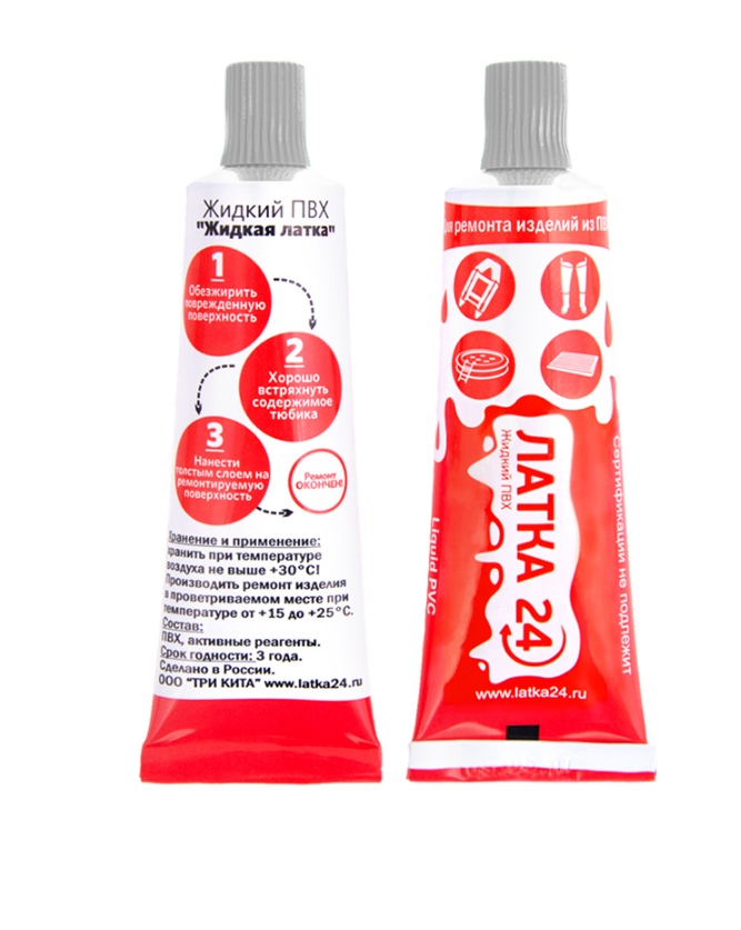 ЛАТКА24 для ремонта любых изделий из ПВХ. Теперь Вам не придется искать латку из похожего материала, чтобы заклеить поврежденные матрас или лодку. Достаточно нанести несколько капель на прокол или порез.