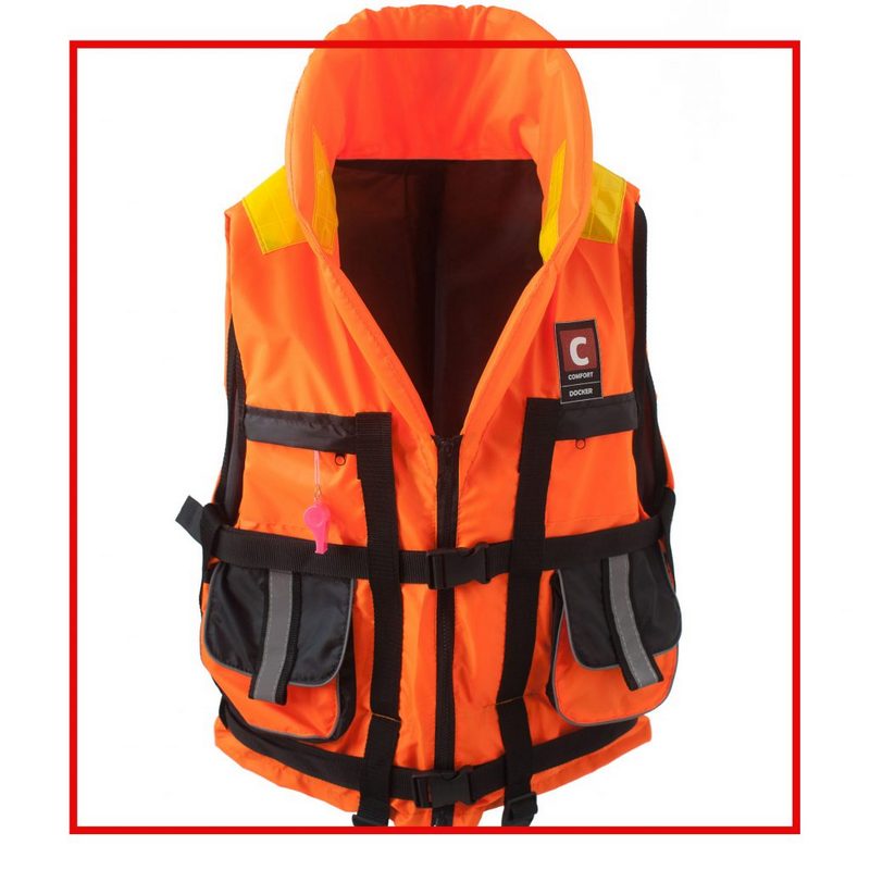 Спасательный жилет COMFORT DOCKER оснащен съемным паховым ремнем, свистком, водостойкими светоотражающими полосами в верхней части, удерживающим подголовником, ременными стропами с защелками типа «фастекс», молнией «трактор» и ярлыком с указанием номера сертификата соответствия и ТУ производителя соответствующего требованиям нормативных документов по ГОСТ 58108-2019.