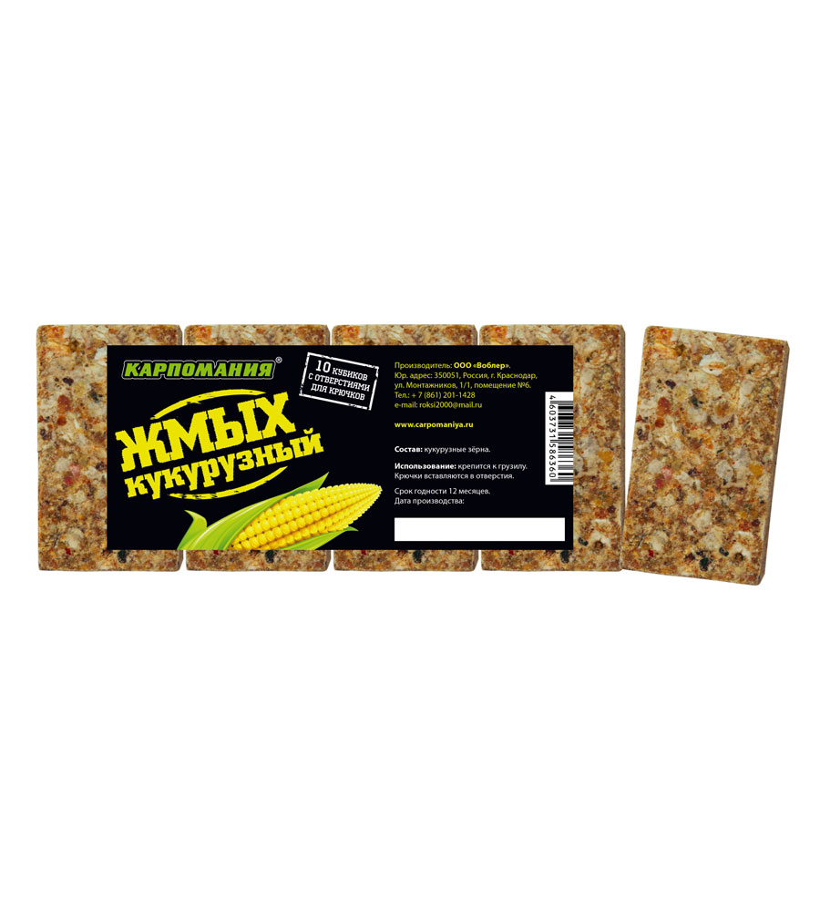 Для производства данной серии используется кукуруза, выращенная на полях Кубани. Для более высокого качества и длительного хранения, смесь проходит термообработку, через горячий пресс, в результате чего приобретает форму кубиков. В верхней части кубиков имеются отверстия для крепления рыболовных крючков. В состав добавляем различные виды зерновых: горох, конопля, пшеница и семечка. Для улучшения вкуса и запаха добавляем ароматизаторы ведущих мировых производителей. Для ловли на кукурузный жмых (кубики) используют специальную снасть, которая состоит из грузила и поводков с крючками. При попадании готовой снасти в воду, жмых начинает растворяться, создавая вокруг мутное облако, приманивая, таким образом, рыбу в зону ловли. После происходит заглатывание крючков, и далее поклевка. Этот вид ловли является одним из самых распространенных видов у рыбаков.